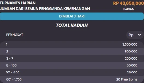 3. Turnamen harian akan berlangsung dari 20:00 hingga 23:59 WIB, dengan 1,700 hadiah harian senilai Rp 43,650,000. Akan ada 28 turnamen selama periode promosi.