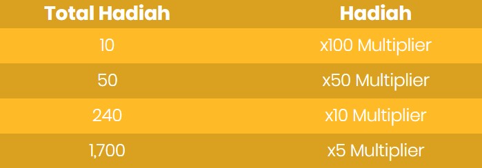 2. Total Hadiah pada promosi ini adalah sebesar IDR 1,431,000,000,- dengan setiap pemain memiliki kesempatan memenangkan hadiah hingga IDR 11,130,000